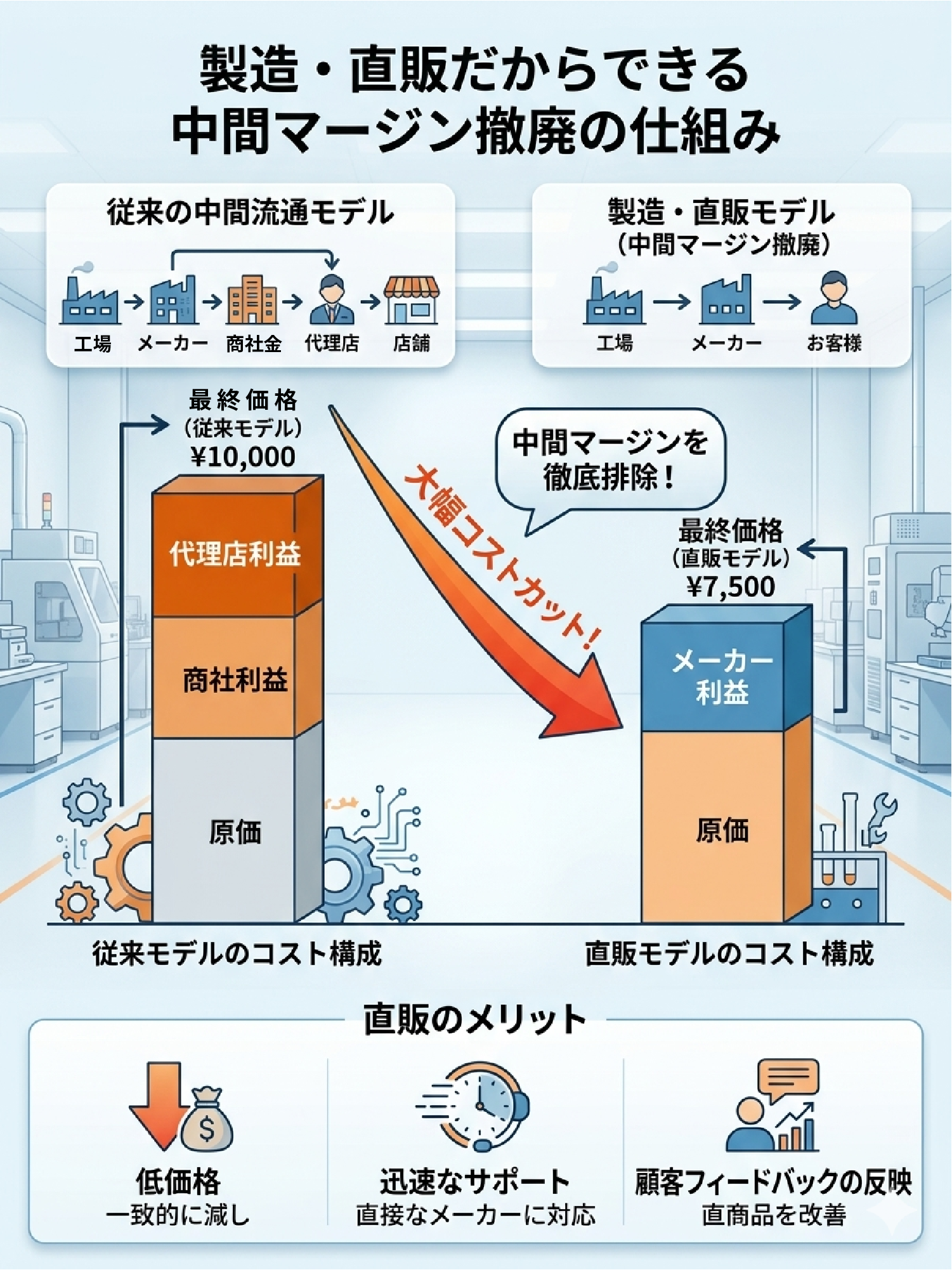 自社製造・そして、できる限り低価格を実現するために代理店を介さず